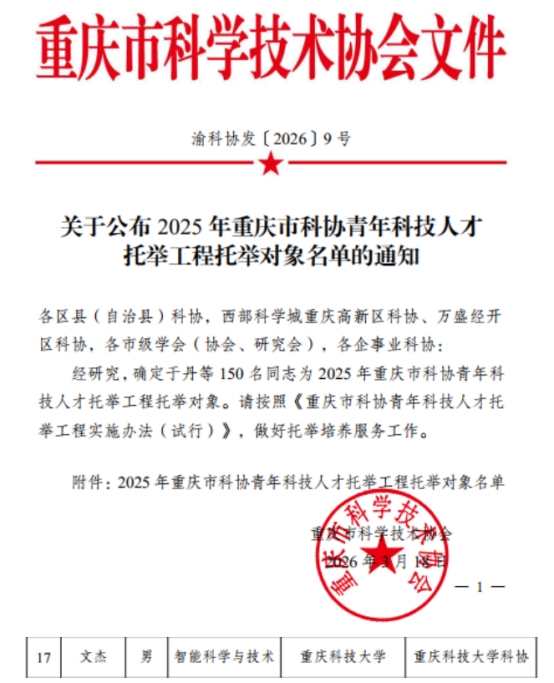 我院文杰副教授成功入选2025年重庆市科协青年科技人才托举工程