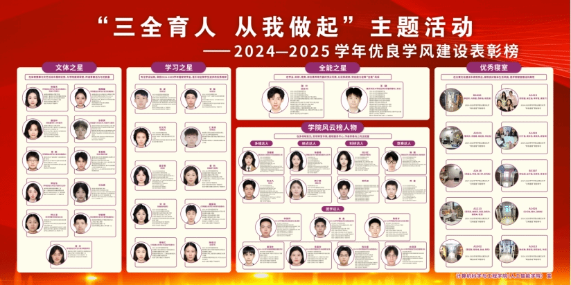 2024-2025 学年,我院以“三全育人 从我做起”为主题推进优良学风建设,涌现诸多先进典型。目前共评选出文体之星“艺体双馨”、学习之星“学业标杆”、全能之星“全面发展”、学院风云榜人物“先锋表率”及优秀寝室“温馨标杆”等多类表彰对象